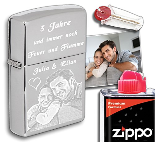 Original Zippo mit deinem Foto | inkl. Geschenkset (Flints, Benzin) |Chrom poliert, chrome high polished | Gravur von deinem Foto